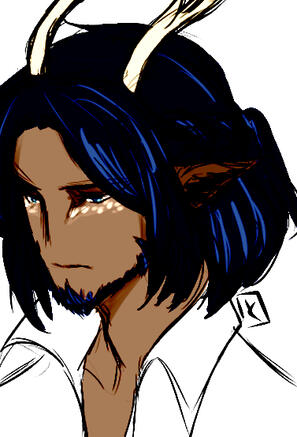 HEIGHT from hooves to the top of his head (not counting his antlers), he is about 7'5 or so. (for reference, normal bull elk are about 4-5 feet from hooves to shoulder, i guess the average upper half of a full grown human being is like a foot and a half or so)WEIGHT who knowsHAIR black with blue undertones. shoulder-length, a good amount of volume. very soft to the touch.EYES blue - grey, but also let's not forget the green that they were as the nowhere king, sometimes that happens.SKIN tawny, warm undertones. his coat does vary in color, from ar eddish brown in summer to dark brown in winter, as would happen in normal elk.BUILD able bodied; broad shouldered and muscular from his job as a rift worker, but not so much so to take away from his natural elegance as an elktaur